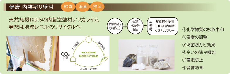 「シリカライム」は、内装塗り壁材(漆喰)で、主成分の音羽晶石の粒度は、希少な音羽晶石を無駄なく100%利用できるように設計されています。抗菌作用、消臭作用、調湿効果があり、まさに「健康塗り壁」としてお勧めしています。 |
